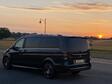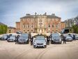 9 black cars and mini buses outside of a manor house with staff in suits beside the vehicles